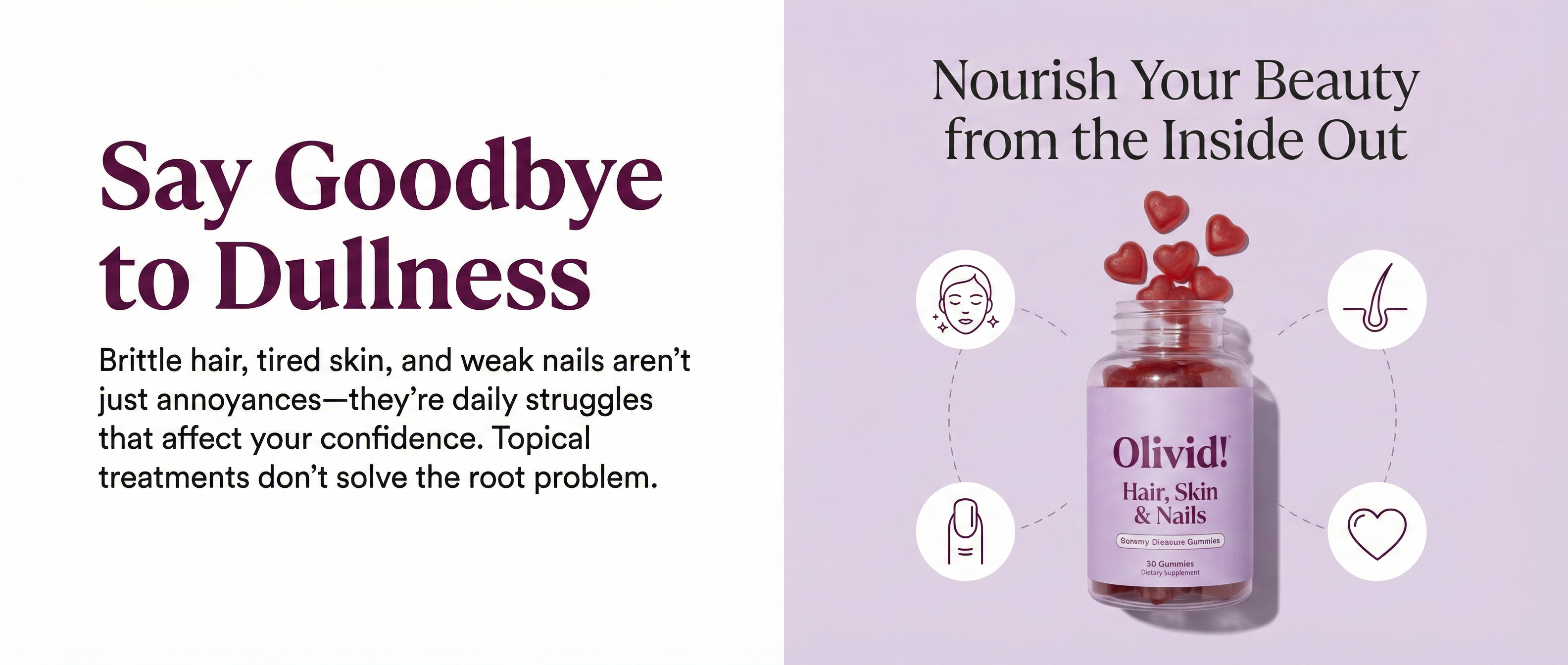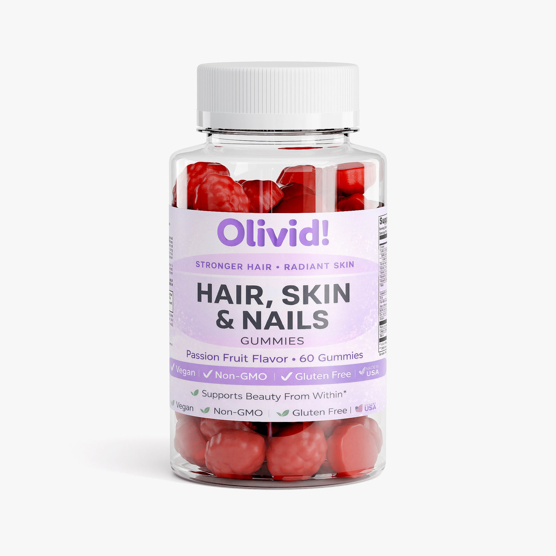 Olivid! Hair, Skin & Nails Gummies are a premium dietary supplement formulated to support and enhance your natural beauty from within. Each delicious gummy is packed with essential vitamins, minerals, and nutrients specifically chosen to promote stronger hair, radiant skin, and healthier nails.